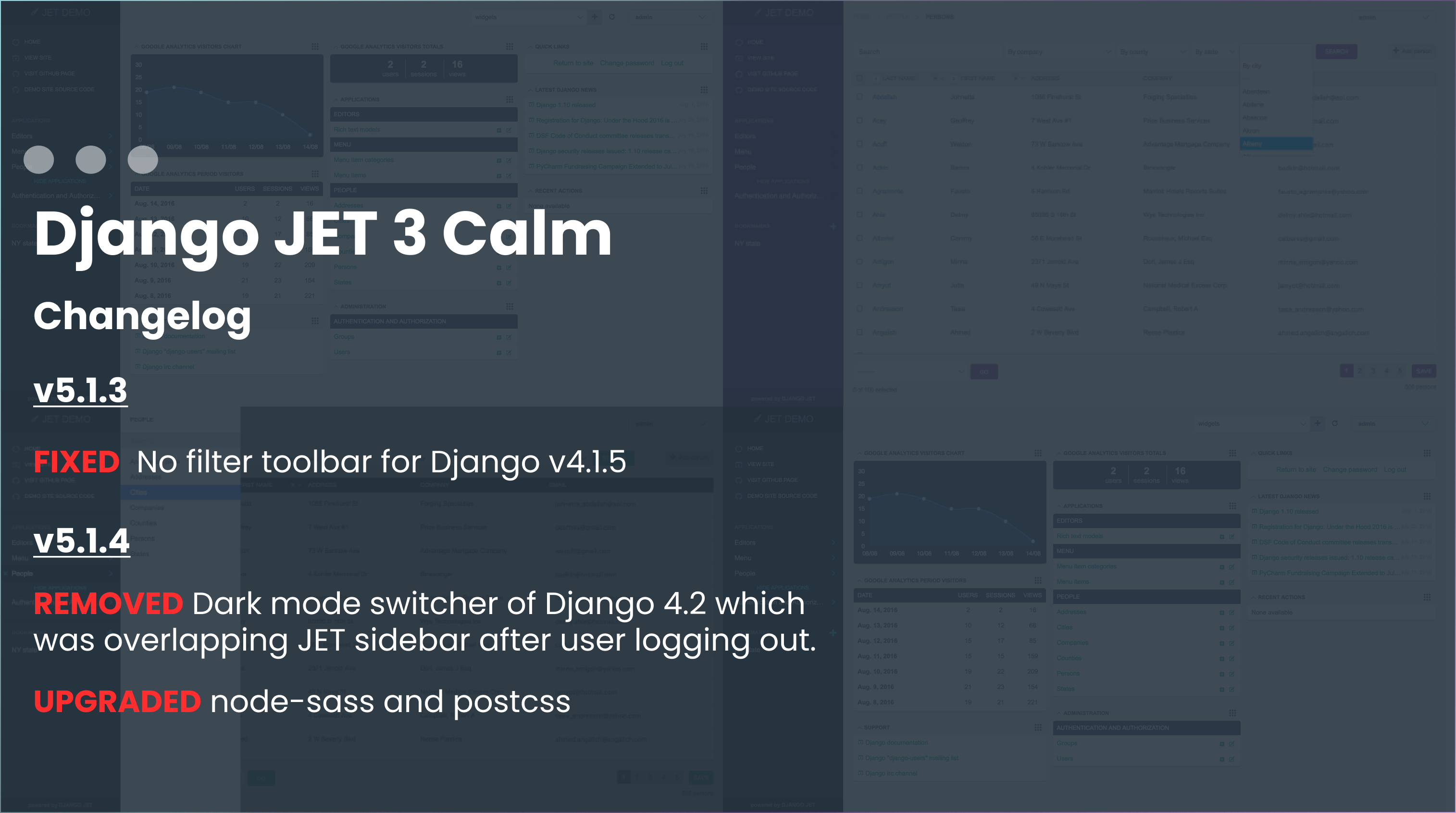 - Removed dark mode switcher of Django 4.2 which was overlapping JET sidebar after user logging-out.