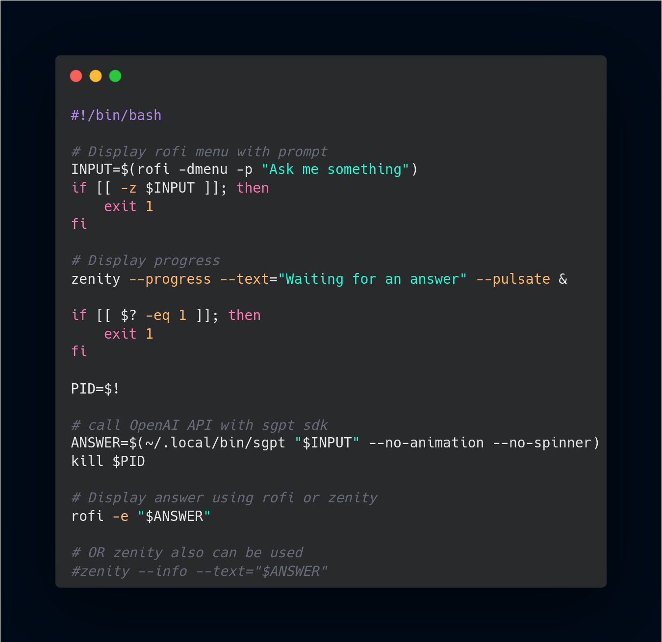 The following shell script is designed to interact with OpenAI's SGPT API and display the result in a user-friendly way using either rofi or zenity. Copy the script to the directory of your preference.